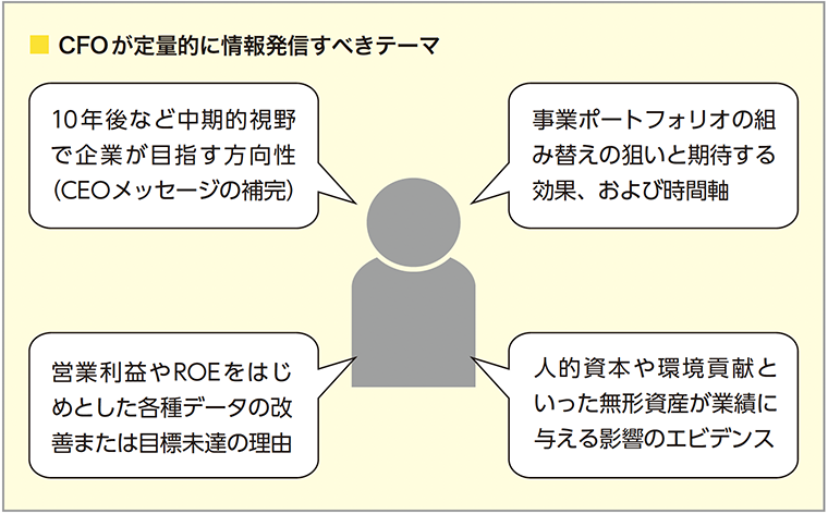 さらに、魅力的なIR情報でも数字を用いた解説がなければ、受け取ったステークホルダーは「なぜ、好調な製品をさらに伸ばすのではなく、新しい分野に進出するのか」など、その実現性に確信が持てない。CFOは社会価値や無形資産に関する目標を経営戦略と紐づけ、データの裏付けのある蓋然性の高いメッセージを発信することが大切といえる。